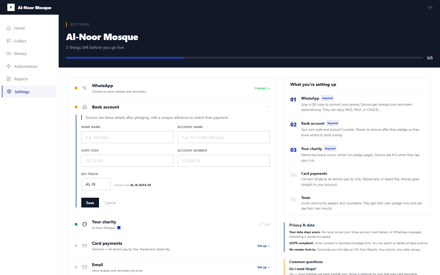 Step 2: 'How will donors pay?' → 3 big clear cards: