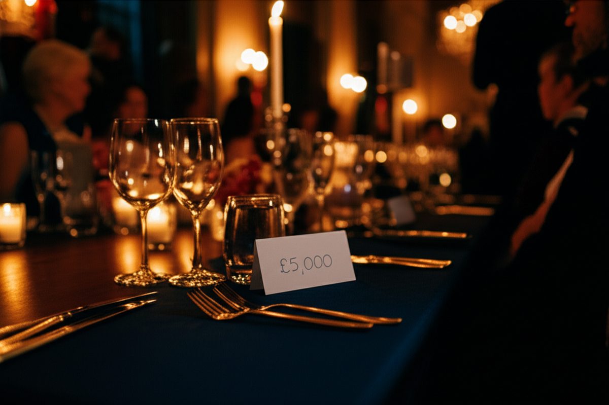 - Regenerated dinner image: dark navy table, candlelight, £5,000