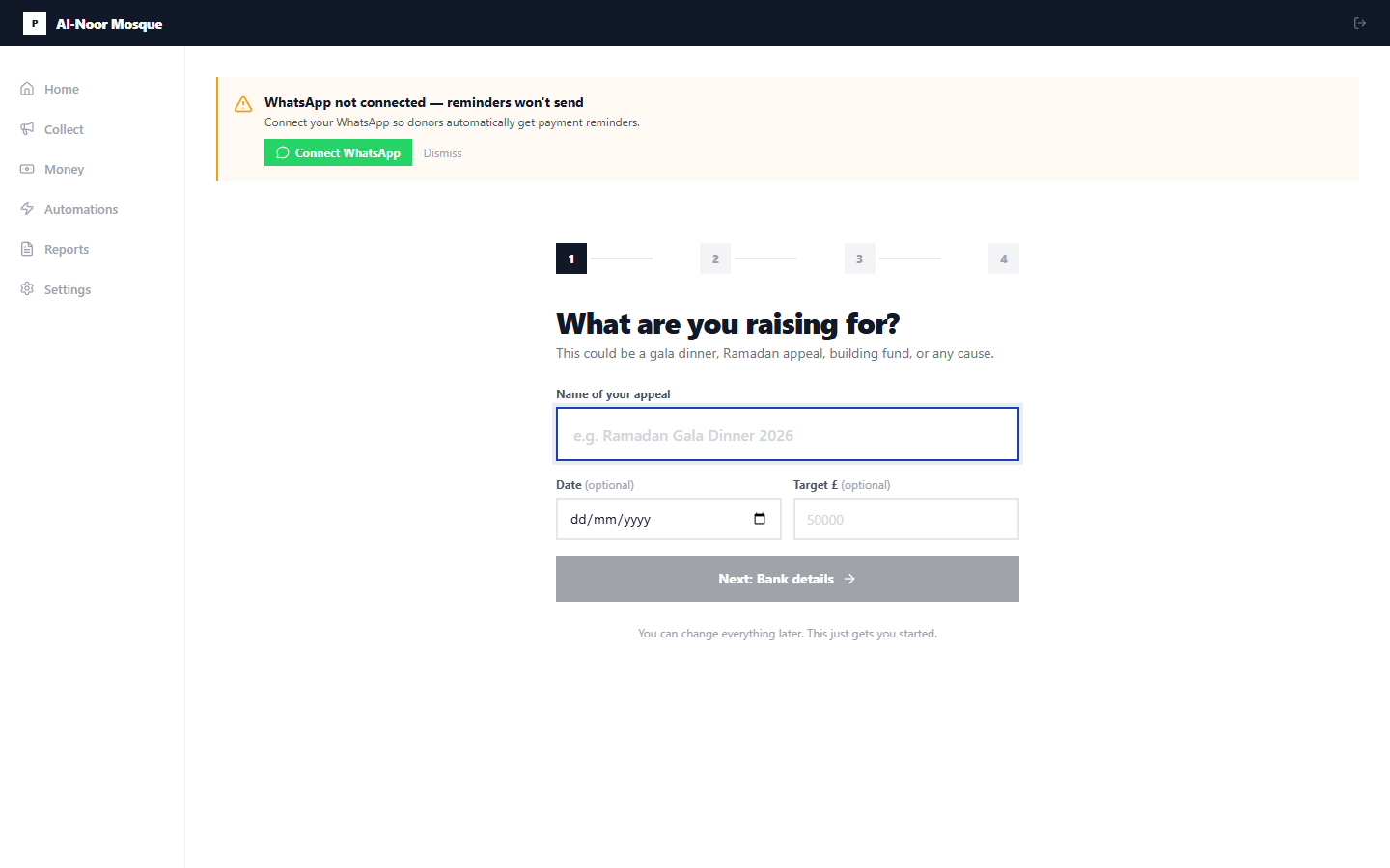 Step 2: 'How will donors pay?' → 3 big clear cards: