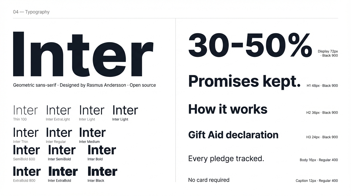 BRAND.md: Complete brand guide with code snippets, color tokens, typography scale, logo usage rules, DO/DON'T checklist, photography direction, voice & tone. Every section references its visual asset in brand/. brand/ folder (52 assets): - photography/ (20) — landing page photos - logo/ (6) — lockup, reversed, blue, marks, favicon - color-palette/ (3) — primary, tints, psychology - typography/ (3) — specimen, scale, numbers - moodboard/ (3) — trust, community, editorial - brand-guide/ (7) — cover through UI patterns - social-templates/ (4) — OG, Instagram, Story, LinkedIn - icons/ (6) — pledge, whatsapp, gift-aid, zakat, dashboard, schedule Also fixed: Nav component still had backdrop-blur-lg (last violation)