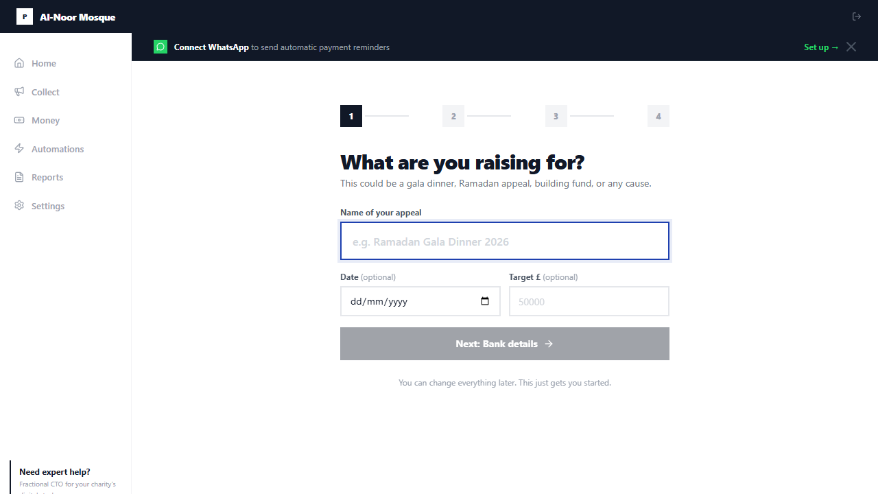 - Org name centered in header, step label on right